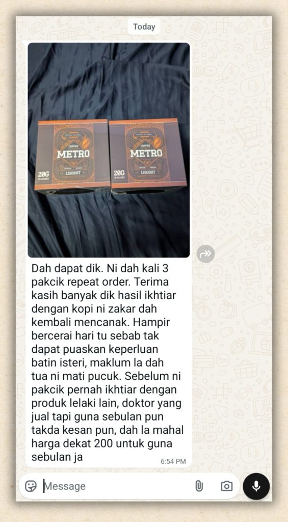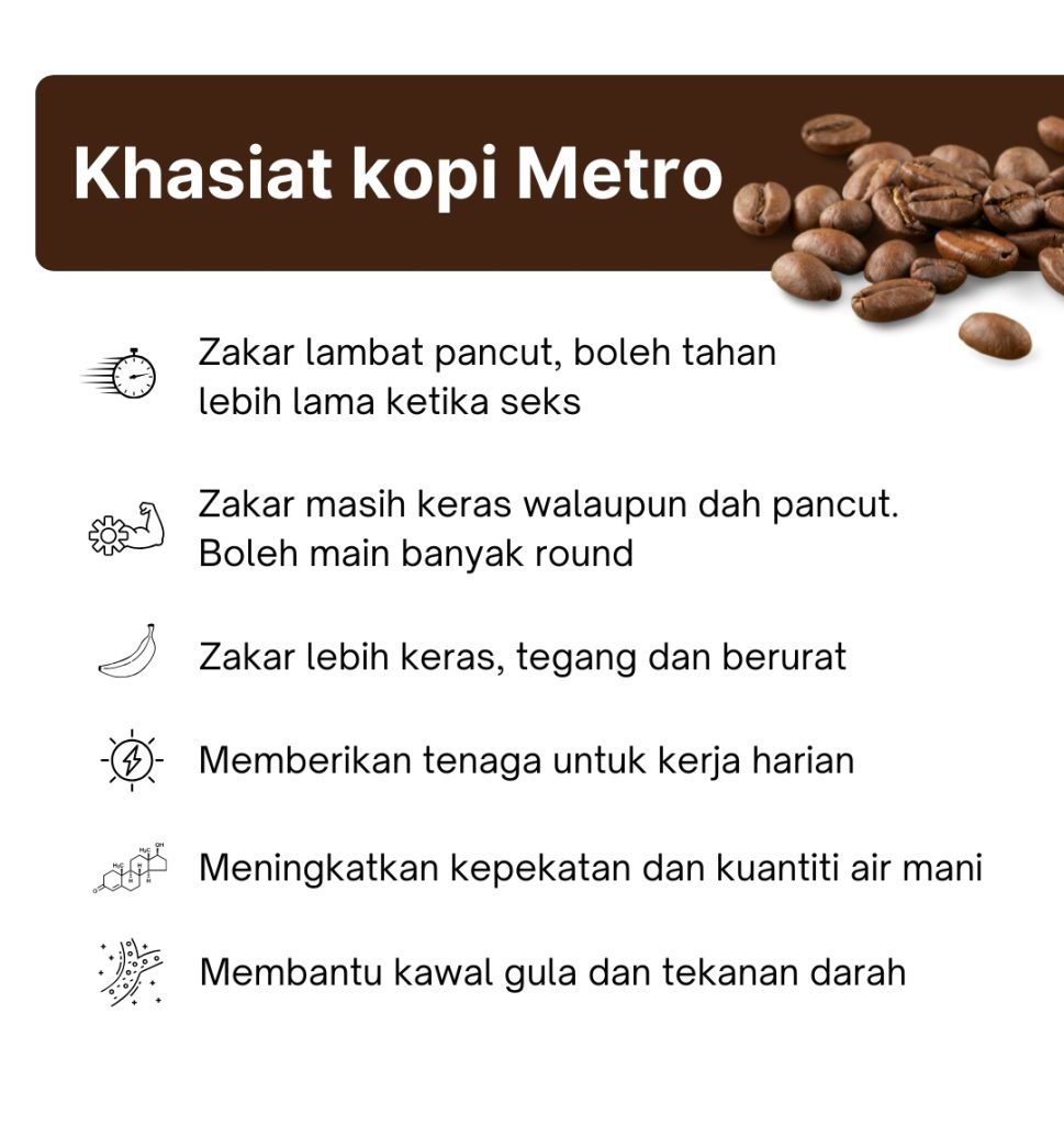 " Memang tak pernah puas main dengan suami sebelum ni sebab dia cepat sangat pancut. Sebab tu saya bagi dia consume Kopi Metro. Kalau nak main sejam tu memang takda masalah. Bagus kopi ni. - Rosmawati, 38, Kerani